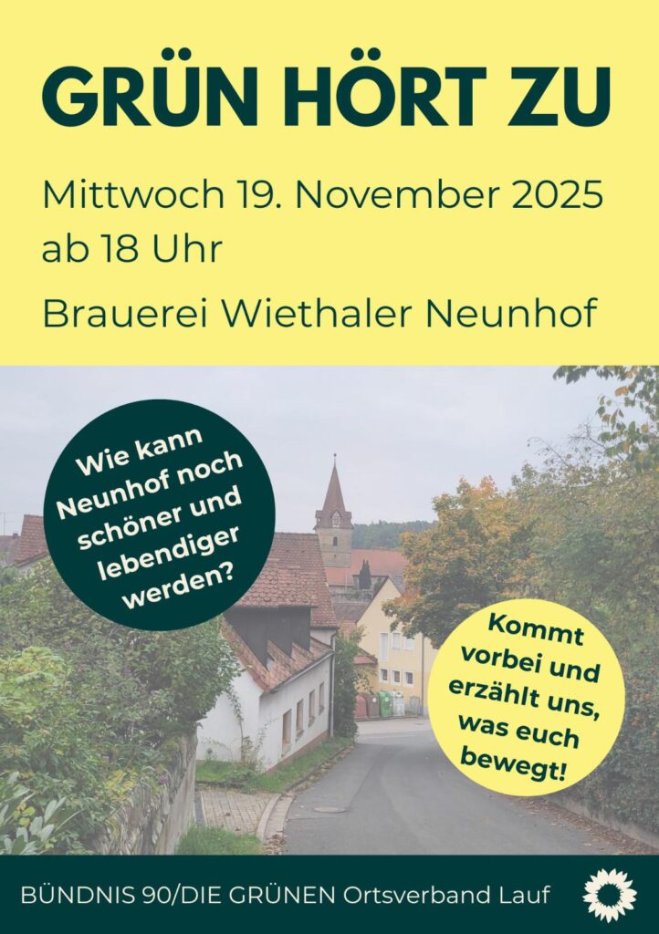 Am 19. November laden wir herzlich zum offenen Austausch im Format „Grün hört zu“ in die Brauerei Wiethaler nach Neunhof ein. Alle Bürger:innen sind willkommen, ihre Themen, Wünsche und Ideen mit uns zu teilen – ganz unter dem Motto: